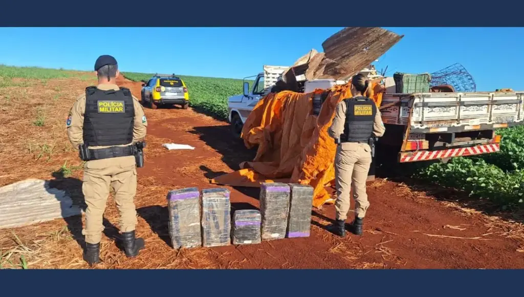 A equipe foi acionada para verificar a situação de um veículo aparentemente abandonado em uma estrada rural. No local, os policiais encontraram um caminhão Ford F-4000, sem ocupantes. Durante a vistoria na cabine do veículo, foram localizados diversos pacotes de grande porte, devidamente embalados e com marcações aparentes de peso, contendo substância análoga à maconha.