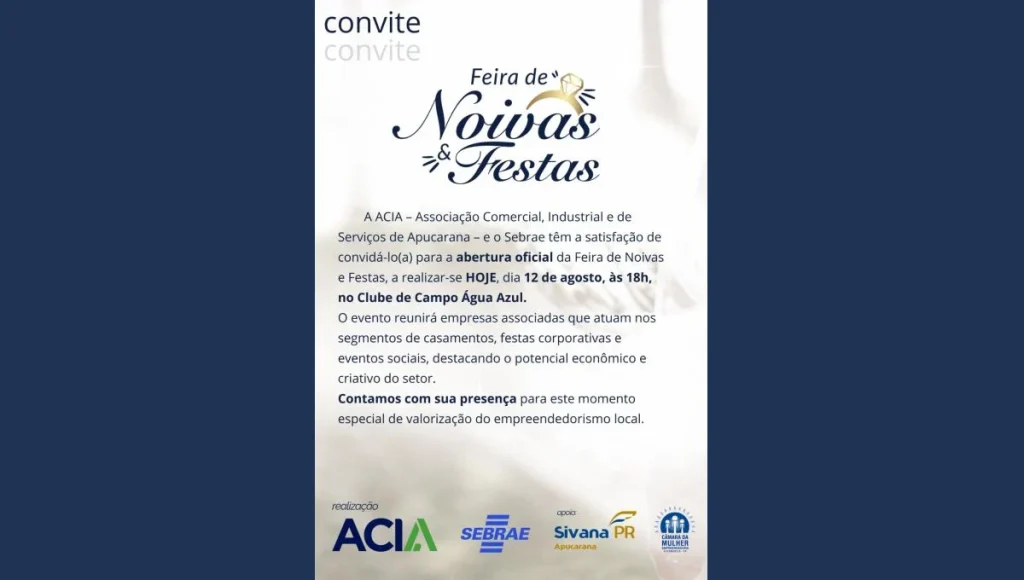 A ACIA – Associação Comercial, Industrial e de Serviços de Apucarana, em parceria com o Sebrae, convida toda a comunidade para a abertura oficial da Feira de Noivas & Festas, que será realizada nesta terça-feira, 12 de agosto, às 18h, no Clube de Campo Água Azul.