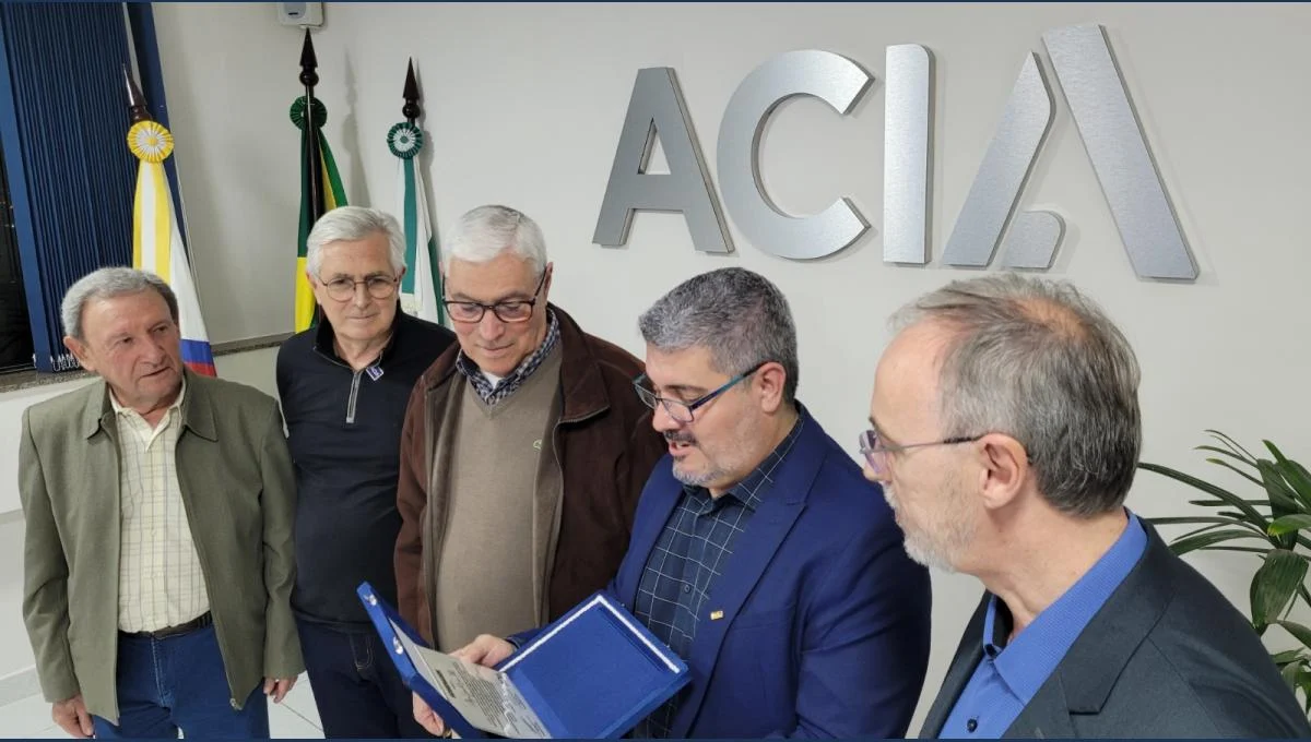 O presidente da ACIA, acompanhado dos senhores Ricardo Amaral, Jayme Leonel e Wanderlei Faganello, entregou ao professor uma placa de homenagem como símbolo de reconhecimento. “Esta placa destaca o seu trabalho e seu legado”, declarou Elio Pinto.