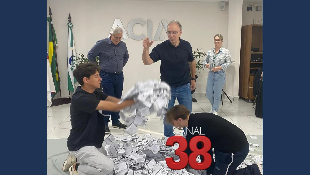 “É com muita satisfação que nós sorteamos agora os primeiros 10 ganhadores de mil reais da campanha da ACIA. Nós temos três sorteios, faltam ainda mais dois. Esses cupons que sobraram vão voltar para ser sorteados novamente, os que não foram sorteados e estão ali ao lado. O importante é que eu não vi nenhuma empresa repetida. Nove ganhadores são de Apucarana e um de Jandaia do Sul. Então vamos falar os nomes: Thaynara Rafaela Fernandes Lins, comprou na Camaleão Tintas; Genivalda dos Santos Belmonte, na Seralê; Gabriel Cristiano Roque, GRG Sport; Salete de Paula Martins, Comercial Ivaiporã; Ilza Floriano Tanabe, Relojoaria Caracol; Maria Zélia Ravar, Esportes Camisa 10; Ebner Bossa, Lamoka; Celina Akemi Oguido Stake, Homem S/A; Flávia Laís Molina, Bellan Autopeças, essa de Jandaia do Sul; e Gustavo da Silva Caldeira, Foto Fanny. Esses são os 10 ganhadores de mil reais sorteados agora. O próximo sorteio será no dia 15 de setembro e depois no dia 15 de outubro.”