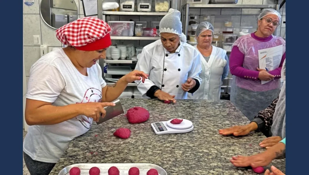 Em Curitiba, por exemplo, as merendeiras prepararam berinjela assada com queijo e pão de beterraba. A experiência foi enriquecedora para Ivonete Stuck Luiz dos Santos, do Colégio Estadual Santa Rosa, que aproveitou para colocar a mão na massa.