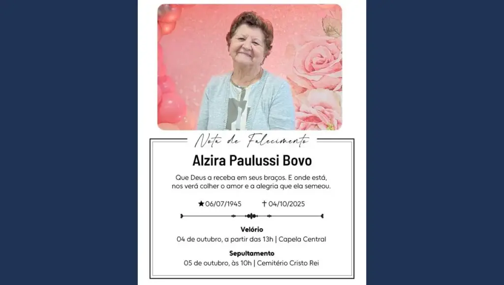 Apucarana lamenta o falecimento de Alzira Paulussi Bovo, ocorrido neste sábado (4), aos 80 anos. Esposa do saudoso Jair Bovo, Alzira estava internada no Hospital da Providência.