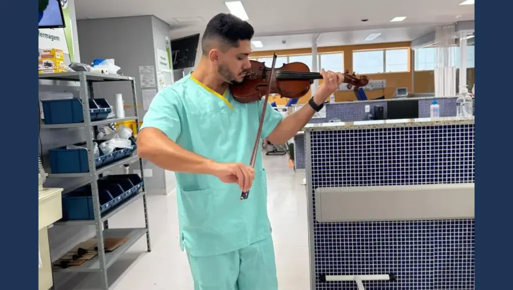 O projeto é desenvolvido pelo médico Joasly Belacusa, que também é violinista. Ele leva o instrumento à unidade e faz apresentações em áreas comuns e próximas aos leitos, envolvendo pacientes, equipes de enfermagem, médicos e demais profissionais. A proposta é utilizar a música como recurso de acolhimento, promovendo conforto e leveza no ambiente hospitalar.
