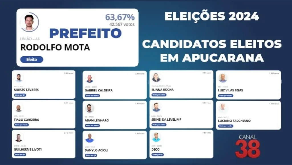 Neste domingo (06), Apucarana elegeu seus novos vereadores em um pleito que mobilizou a população. Abaixo estão os nomes dos candidatos que conquistaram as cadeiras na Câmara Municipal, juntamente com o número de votos obtidos: