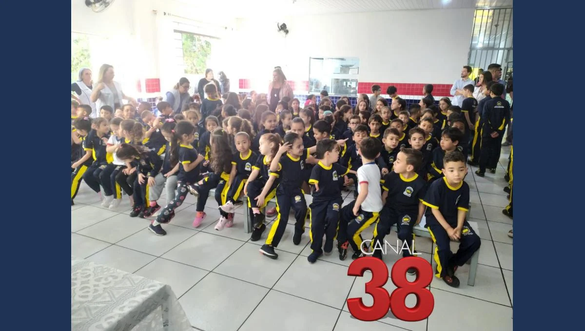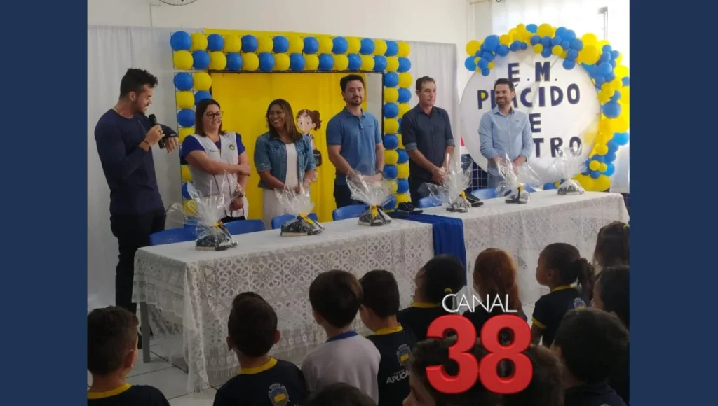 Então eu quero agradecer muito a nossa secretária Ana Paula, o João, toda a nossa equipe pedagógica da autarquia, as nossas coordenadoras e diretoras, diretores das nossas escolas, que, aliás, no mês de abril, assumiram os novos diretores e diretoras num processo inédito de democratização da escolha de diretores e diretoras. Pela primeira vez na história, os nossos servidores da educação foram ouvidos no processo de escolha de diretoras e diretores. Então, de fato, um novo momento da educação de Apucarana, e a gente está muito feliz hoje de celebrar esse momento com a entrega do tênis e da meia para todos os nossos alunos.”