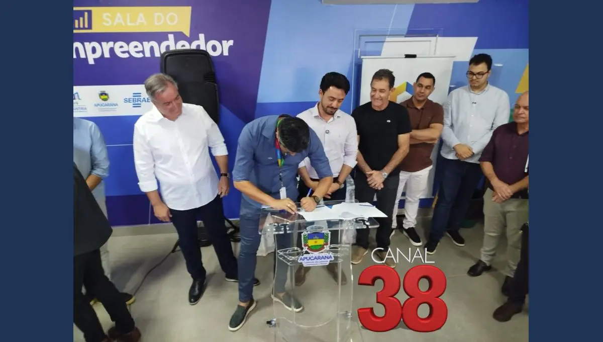 A Prefeitura compra milhões de reais por ano de tudo que vocês imaginam: desde um uniforme até uma caneta, um lápis, um pneu, contratar gente para lavar carro, manutenção de ar-condicionado. Tudo isso pode ser feito por pessoas de Apucarana. E esse escritório, essa parceria com o Sebrae, vai servir pra isso.”**