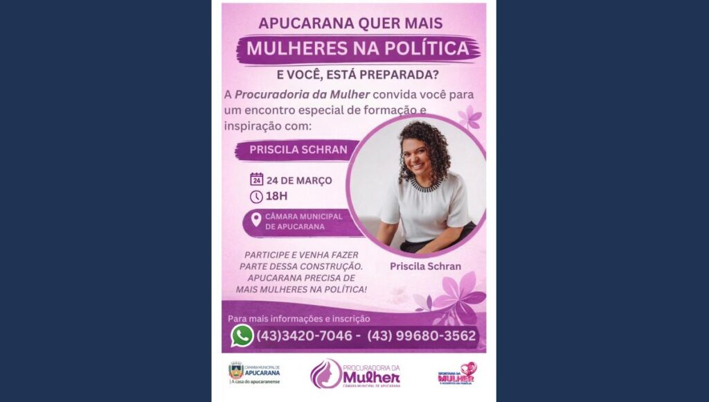A Procuradoria da Mulher da Câmara Municipal de Apucarana promove no próximo dia 24 de março um encontro especial voltado à formação, inspiração e incentivo à participação feminina na política em Apucarana. O evento terá como convidada a palestrante Priscila Schran.