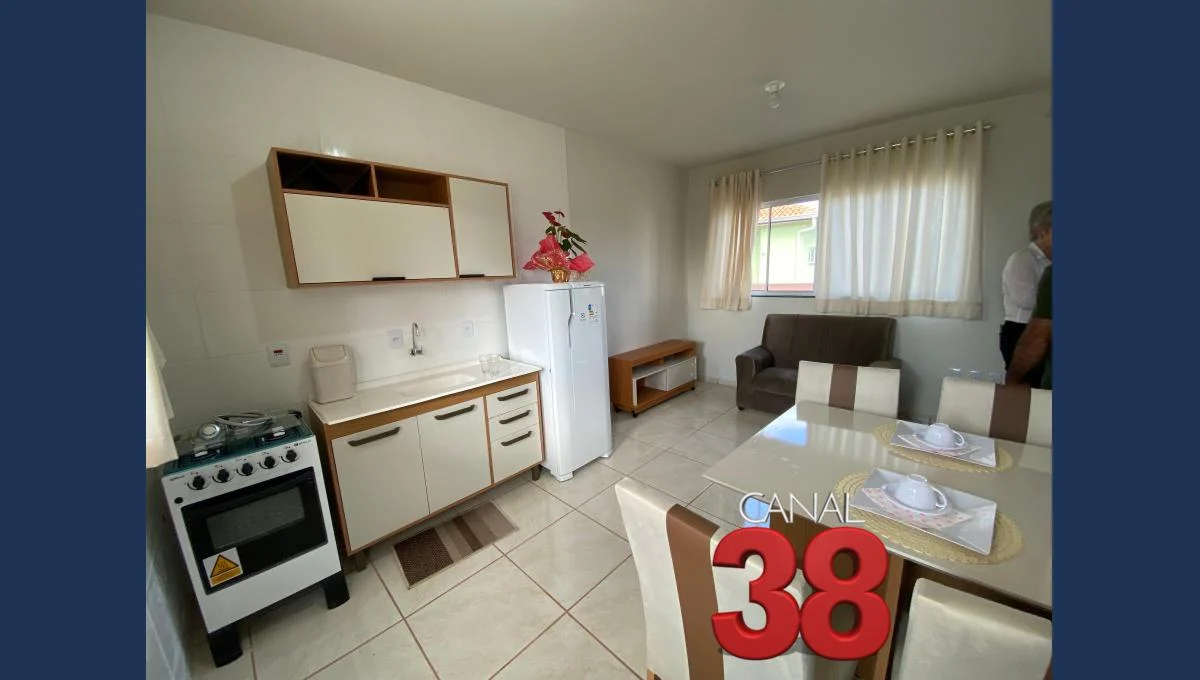 Cada moradia conta com sofá de dois lugares, rack, pia, armário de parede, mesa, quatro cadeiras, geladeira, fogão, cama com cabeceira, colchão e guarda-roupas.