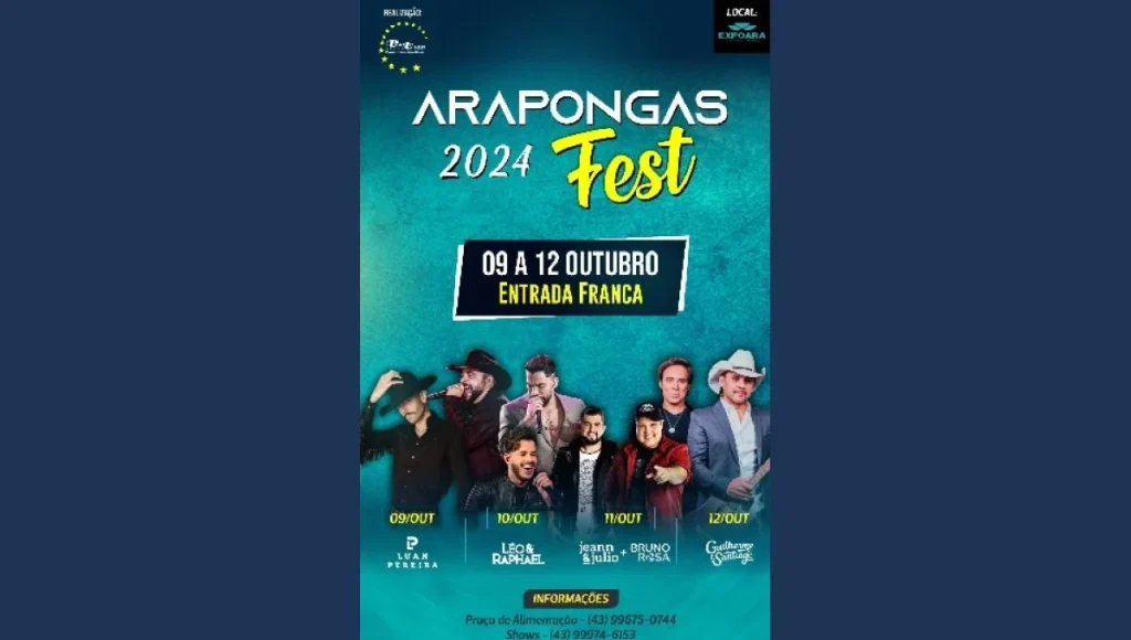 A Arapongas Fest 2024 terá shows de Luan Pereira, Jean e Júlio, Léo e Rafael, Bruno Rosa, Guilherme e Santigo, além de atrações musicais regionais.