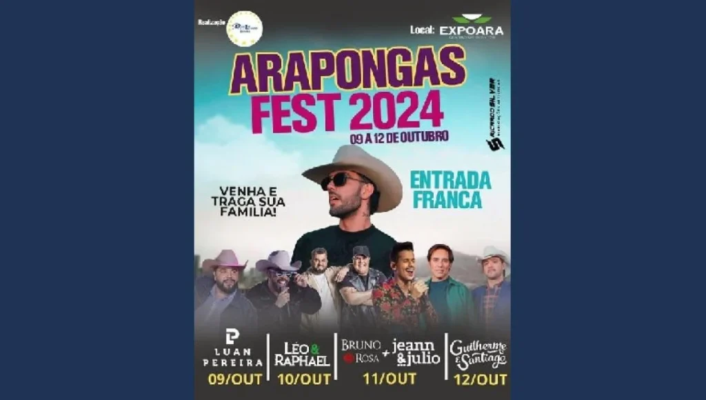 A cidade de Arapongas convida a todos para celebrar mais um ano de história com o Arapongas Fest 2024, um evento repleto de grandes shows e muita diversão, que acontecerá de 9 a 12 de outubro, no Expoara – Centro de Eventos.