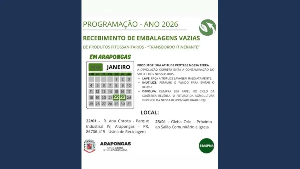 A Prefeitura de Arapongas, por meio da Secretaria Municipal de Agricultura, Serviços Públicos e Meio Ambiente (SEASPMA), informa aos produtores do município que haverá o recebimento de embalagens vazias de produtos fitossanitários nesta semana. Serão duas ações de transbordo itinerante – na quinta (22), na Rua Anu-Coroca, Parque Industrial IV, na Usina de Reciclagem; e sexta-feira (23), na Gleba Orle, próximo ao salão comunitário e à igreja.