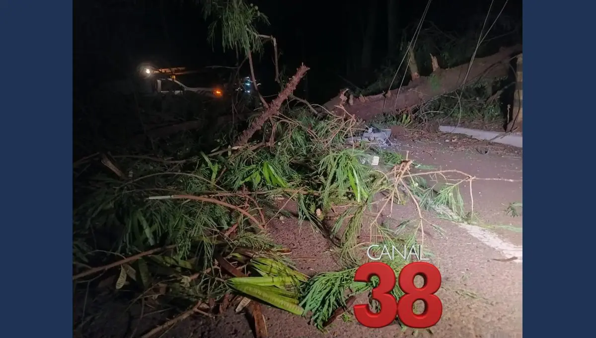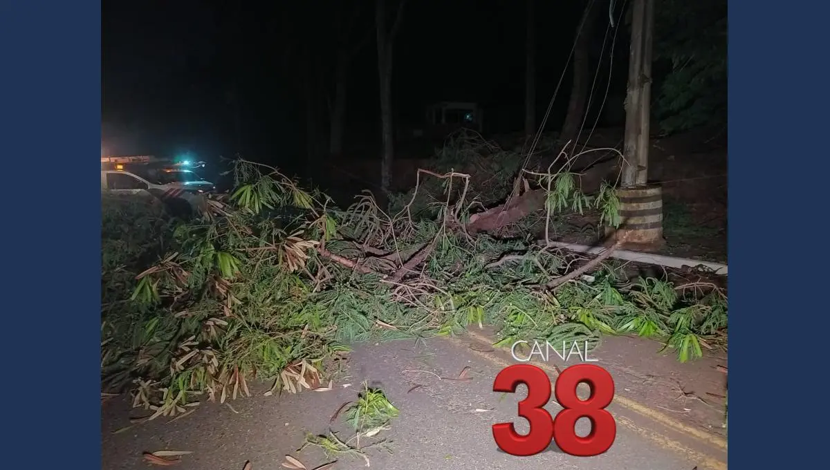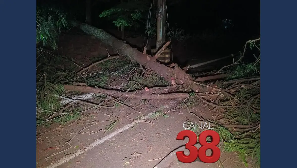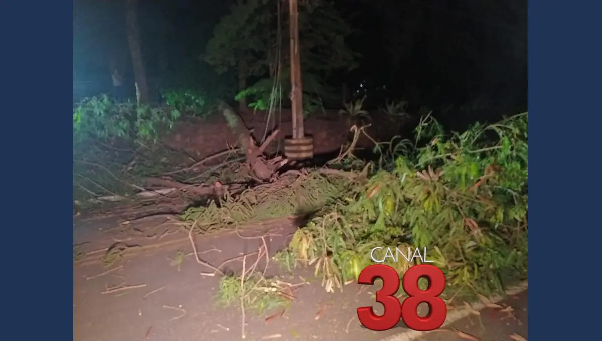 Na noite deste sábado (04), uma árvore de grande porte, da espécie Pinho Araucária, caiu sobre a rede de alta tensão na Avenida Jaboti, próximo à ACEA e ao Hospital Torao Tokuda, em Apucarana.