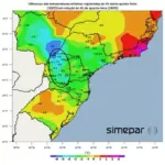 Durante a quinta-feira, a chance de chuva sobre o território paranaense reduz, com ocorrências mais pontuais no interior ao longo de todo o dia. No sul, leste e Campos Gerais,