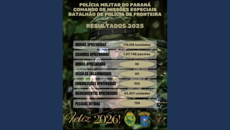O Batalhão de Polícia de Fronteira (BPFRON), da Polícia Militar do Paraná, por meio do Comando de Missões Especiais, divulgou o balanço dos resultados alcançados ao longo de 2025, destacando