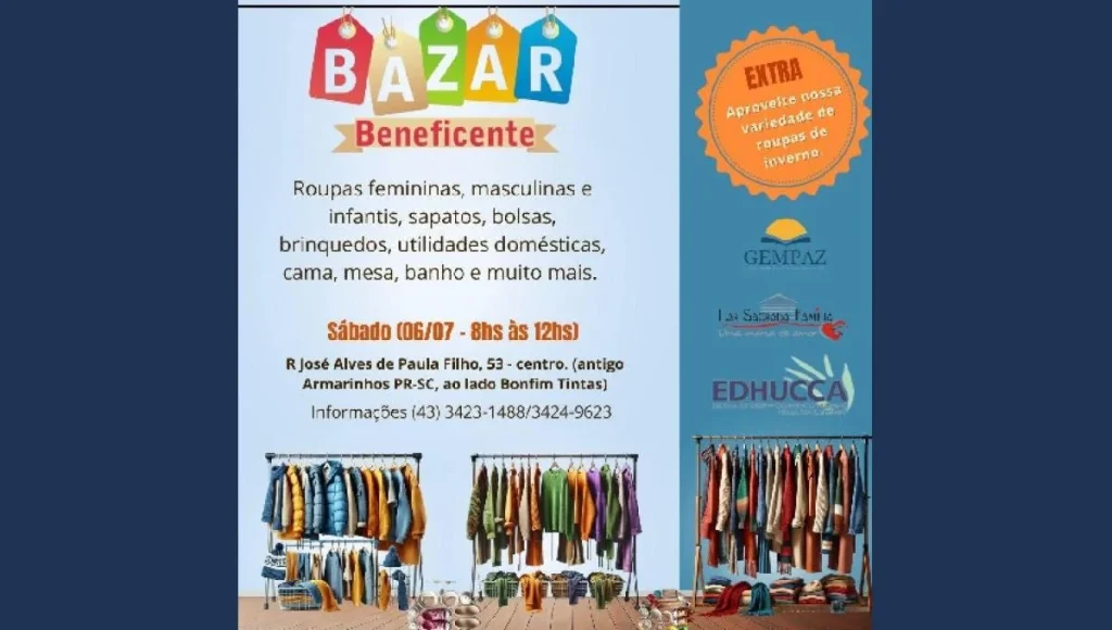 No bazar, serão disponibilizadas roupas femininas, masculinas e infantis, além de sapatos, bolsas, brinquedos, utilidades domésticas, artigos de cama, mesa e banho, entre outros. Este evento é organizado pelo GEMPAZ em benefício do EDHUCCA, Lar Sagrada Família e Recanto Allan Kardec.