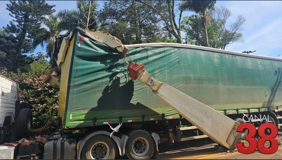 O GM Passoni, responsável pelo atendimento da ocorrência, contou como encontrou a situação logo ao chegar. “Na realidade, ao chegar no local, já nos deparamos com a cena. Em conversa com o condutor da carreta, ele explicou que foi fazer a curva e uma parte da carreta pegou no portal, veio arrastando, arrancou o portal e agora está sobre o veículo”, relatou.