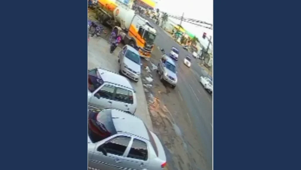 As imagens mostram o momento em que a vítima atravessava a via na faixa de pedestres, em frente a um posto de combustíveis, e foi atingida por um veículo Volkswagen Up, que entrou na via.