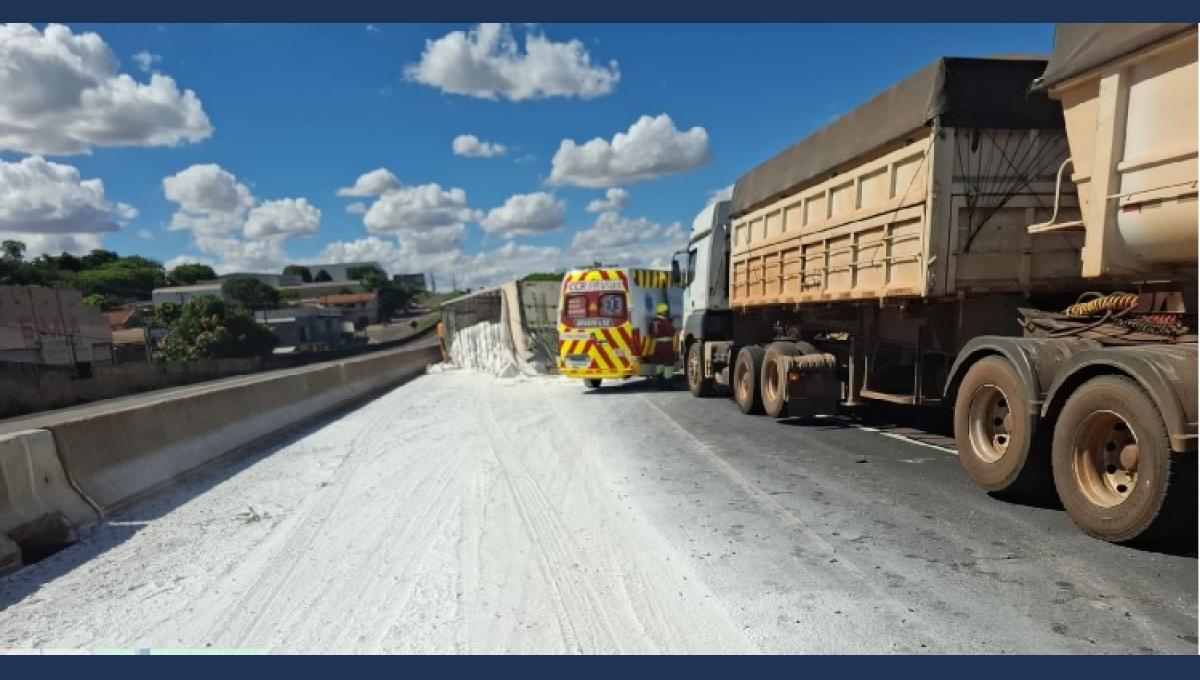 Conforme as informações levantadas no local, o conjunto veicular formado por um Mercedes-Benz Axor 2536, que tracionava um semirreboque SR/Noma, seguia pela rodovia quando ocorreu o tombamento.