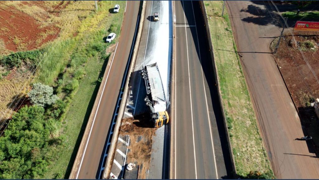 Conforme as informações levantadas no local, o conjunto veicular formado por um Mercedes-Benz Axor 2536, que tracionava um semirreboque SR/Noma, seguia pela rodovia quando ocorreu o tombamento.