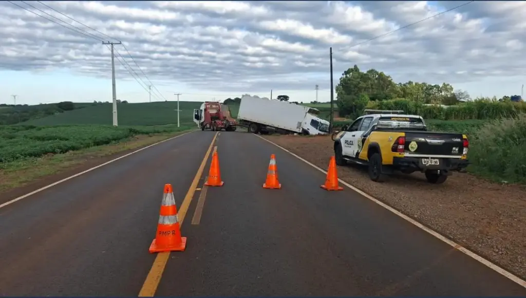De acordo com as informações, um caminhão Mercedes-Benz Atego, com placas de Santa Catarina, trafegava pela rodovia no sentido ao entroncamento com a PRC-466, quando o condutor perdeu o controle da direção e acabou colidindo contra um barranco, parando na margem esquerda da via, conforme o sentido de tráfego.