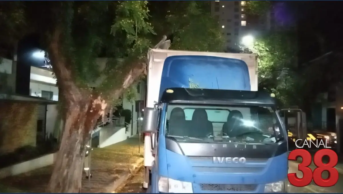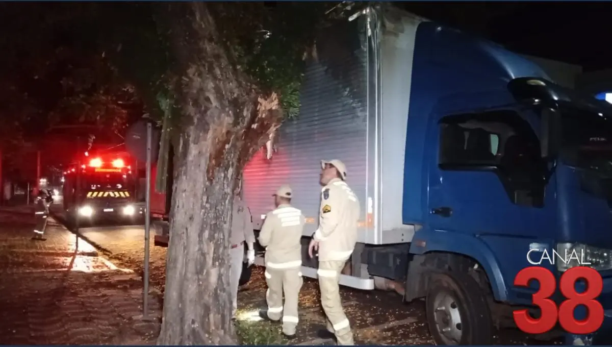 Na noite desta quinta-feira (06), um caminhão acabou ficando enroscado em uma árvore na Rua Clotário Portugal, na região central de Apucarana. O Corpo de Bombeiros foi acionado para atender a ocorrência e liberar a via.