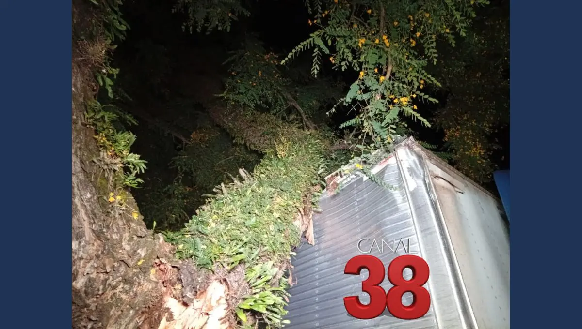 De acordo com informações, o caminhão trafegava pela rua quando o baú colidiu contra um tronco que avançava sobre a pista, ficando preso na estrutura da árvore e causando danos significativos ao veículo.