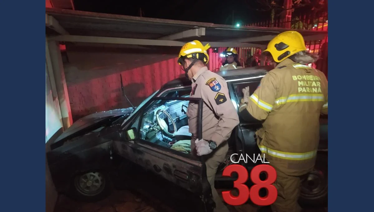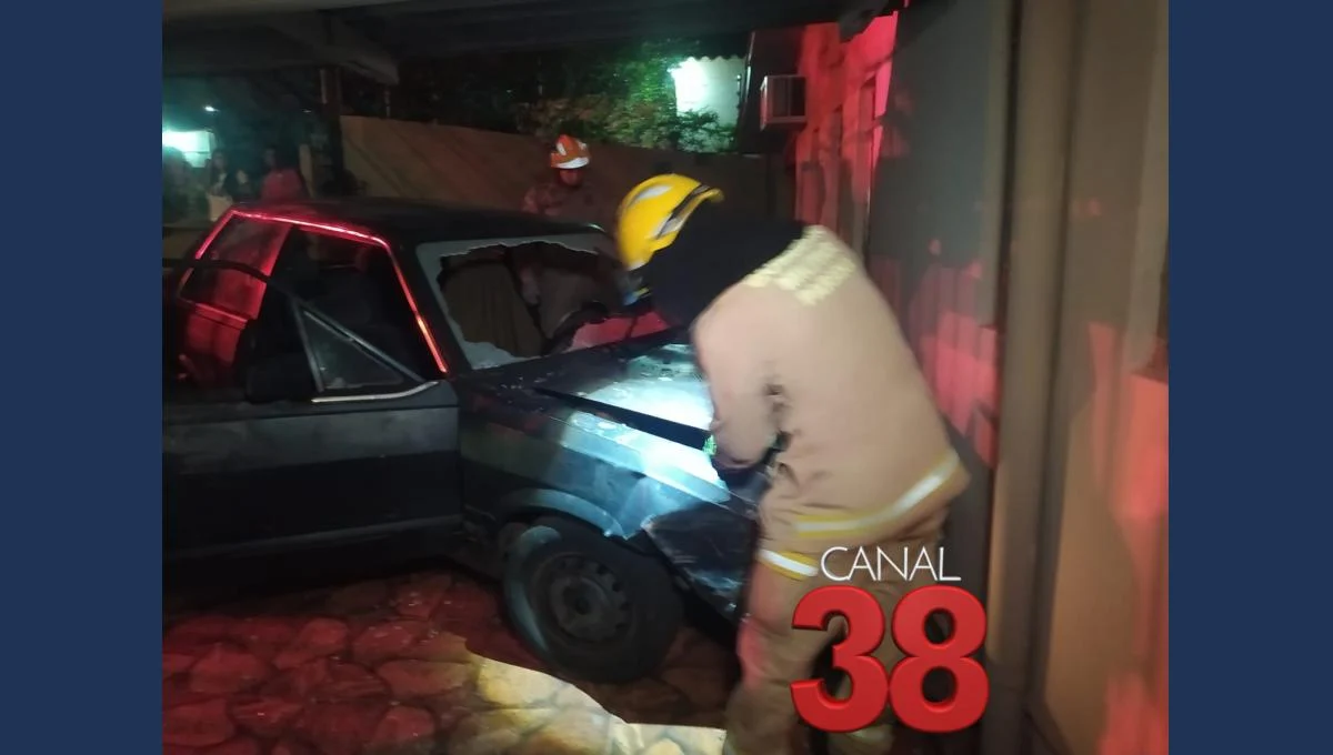O carro raspou no muro de uma residência, atingiu o portão e invadiu a garagem, colidindo ainda contra outra parede da casa.