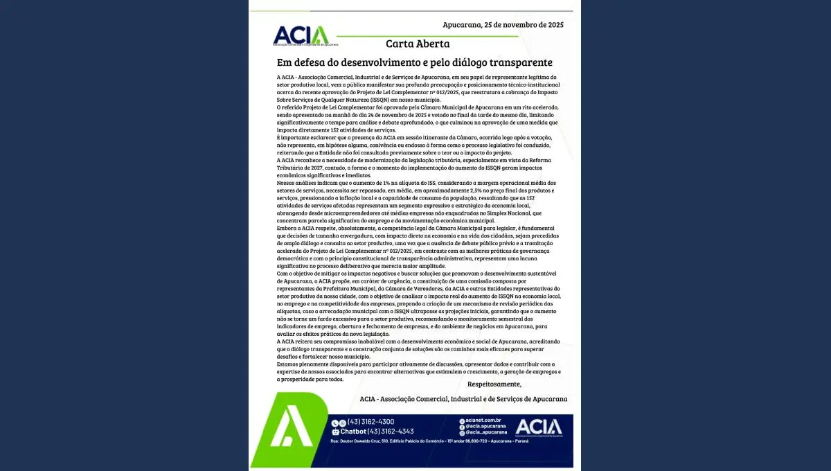 A ACIA – Associação Comercial, Industrial e de Serviços de Apucarana, em seu papel de representante legítima do setor produtivo local, vem a público manifestar sua profunda preocupação e posicionamento técnico-institucional acerca da recente aprovação do Projeto de Lei Complementar nº 012/2025, que reestrutura a cobrança do Imposto Sobre Serviços de Qualquer Natureza (ISSQN) em nosso município.