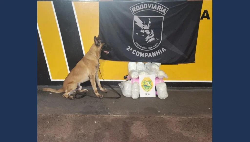 Os cães farejadores ARIUS e AIRON indicaram positivamente uma mala rosa no bagageiro do ônibus, pertencente a um homem de 32 anos e sua esposa de 44 anos, ambos de Toledo-PR. Ao abrir a bagagem, foram encontrados 12 pacotes de maconha do tipo “morruga”, totalizando 6,3 kg.