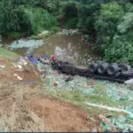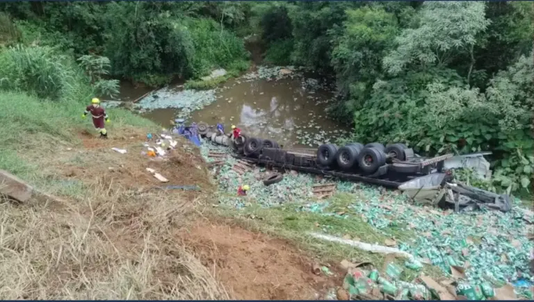 Caminhoneiro morre após tombar e cair em rio, e 15 pessoas são presas por saquear carga de cerveja durante resgate no PR