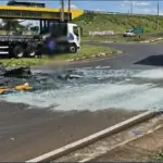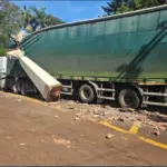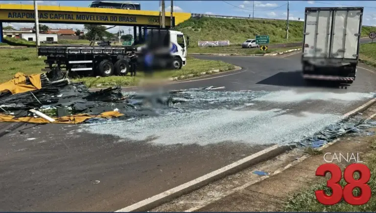 Um acidente inusitado foi registrado na tarde desta sexta-feira (28) na rotatória da PR-218, nas proximidades da Avenida Gaturamo, em Arapongas. Segundo informações repassadas pelo próprio condutor do caminhão, ele