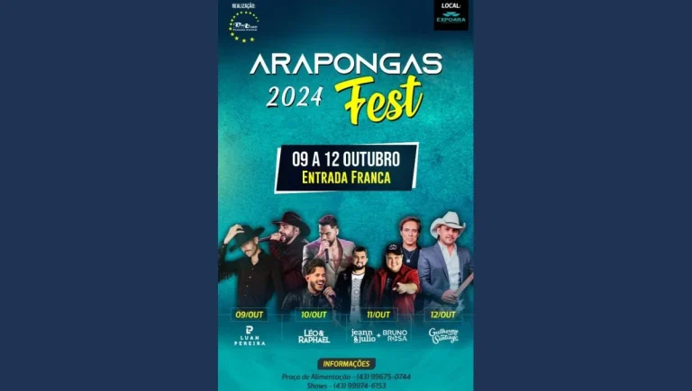 Começa nesta quarta-feira (09) Arapongas Fest 2024 no Centro de Eventos Expoara. Os 77 anos da “Cidade dos Pássaros” será comemorado em grande estilo. A Arapongas Fest 2024 começa nesta