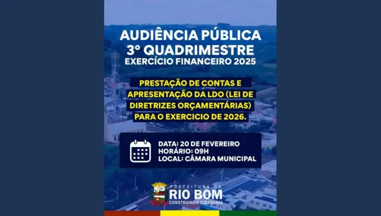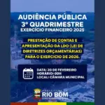 Prestação de contas e apresentação da LDO 2026 A Câmara Municipal de Rio Bom realiza no próximo dia 20 de fevereiro de 2026 (quinta-feira), às 9 horas, uma Audiência Pública