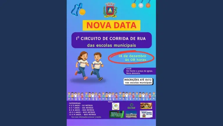 A secretaria Municipal de Educação, através da escola Municipal de Nova Amoreira, informa que o 1º Circuito de Corrida de Rua das Escolas Municipais, que iria acontecer no domingo (16),