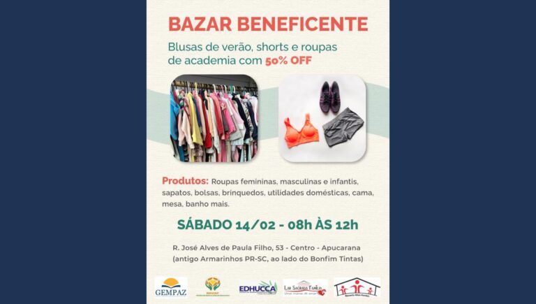 Uma ótima oportunidade para renovar o guarda-roupa e ainda contribuir com uma causa social acontece neste sábado (14), em Apucarana. O GEMPAZ promove um Bazar Beneficente com descontos especiais e