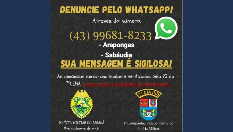 A Polícia Militar de Arapongas e Sabáudia anunciou a criação de um novo canal exclusivo para o recebimento de denúncias. Através do número (43) 99681-8233, os moradores dessas cidades poderão