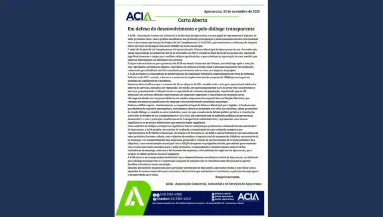 A ACIA – Associação Comercial, Industrial e de Serviços de Apucarana, em seu papel de representante legítima do setor produtivo local, vem a público manifestar sua profunda preocupação e posicionamento