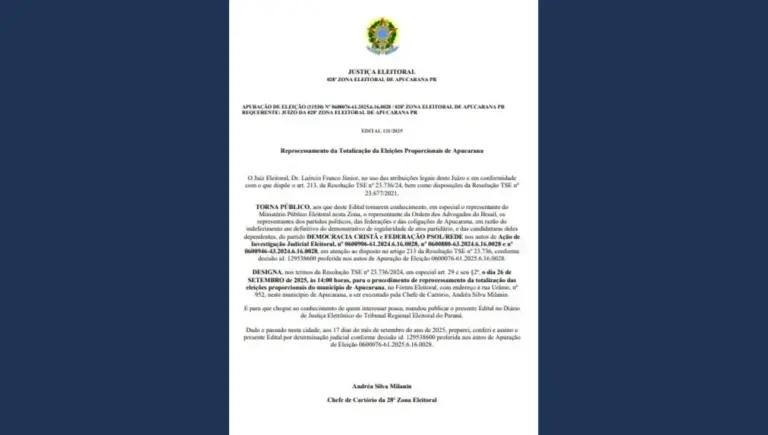 A Justiça Eleitoral da 28ª Zona Eleitoral de Apucarana publicou, nesta quarta-feira (17), o Edital nº 131/2025, determinando o reprocessamento da totalização das eleições proporcionais do município. O juiz eleitoral