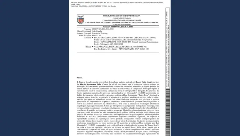 A Justiça de Apucarana concedeu tutela de urgência e determinou que a Viação Apucarana Ltda (VAL) cumpra imediatamente a Lei Municipal nº 122/2025, que institui o chamado “Banco Rosa” no