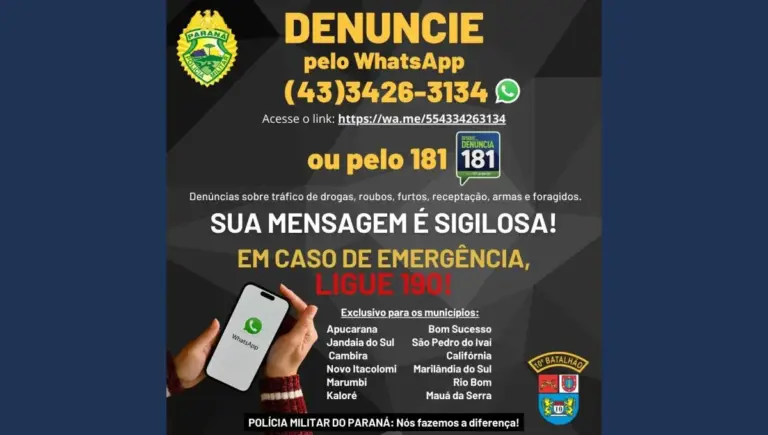 A Polícia Militar do Paraná, por meio do 10º Batalhão, reforça a importância da participação da população no combate à criminalidade, disponibilizando canais oficiais para o registro de denúncias de