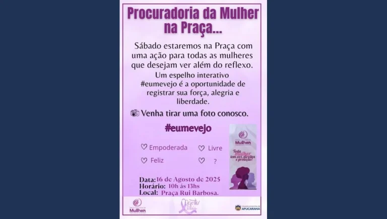 Neste sábado (16) , a Procuradoria da Mulher estará presente na Praça Rui Barbosa, em Apucarana, das 10h às 13h, com uma ação voltada para todas as mulheres. O evento