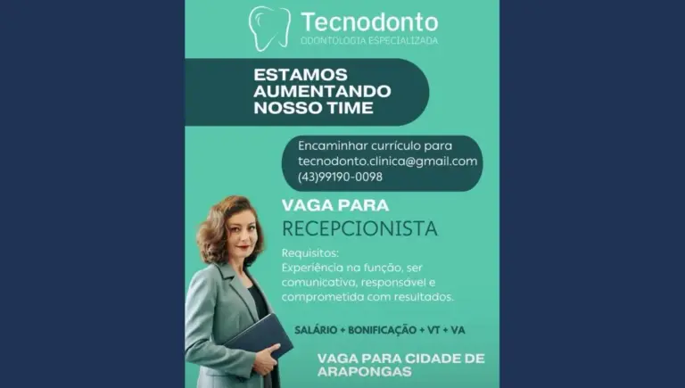 A clínica de odontologia especializada Tecnodonto está com processo seletivo aberto para a contratação de uma recepcionista na cidade de Arapongas. A oportunidade busca profissionais com experiência na função, boa