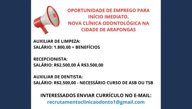 Moradores de Arapongas que estão em busca de uma oportunidade no mercado de trabalho podem aproveitar as vagas abertas por uma nova clínica odontológica que está em fase de implantação