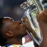 Atacante foi o destaque do Real Madrid na última edição da competição O atacante brasileiro Vinicius Júnior, do Real Madrid (Espanha), finalmente recebeu nesta segunda-feira (16) o troféu de melhor