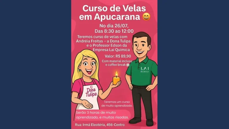 Apucarana recebe uma atividade criativa e sensorial no próximo sábado, 26 de julho. Das 8h30 às 12h, acontece o Curso de Velas Artesanais, conduzido pela especialista Andréia Freitas, conhecida como