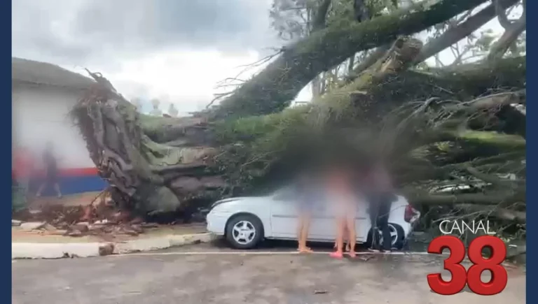 Acidente ocorreu na tarde desta terça-feira (10); felizmente, não houve feridos, apenas danos materiais. Uma árvore de grande porte caiu na tarde desta terça-feira (10) em frente ao Cemitério Cristo