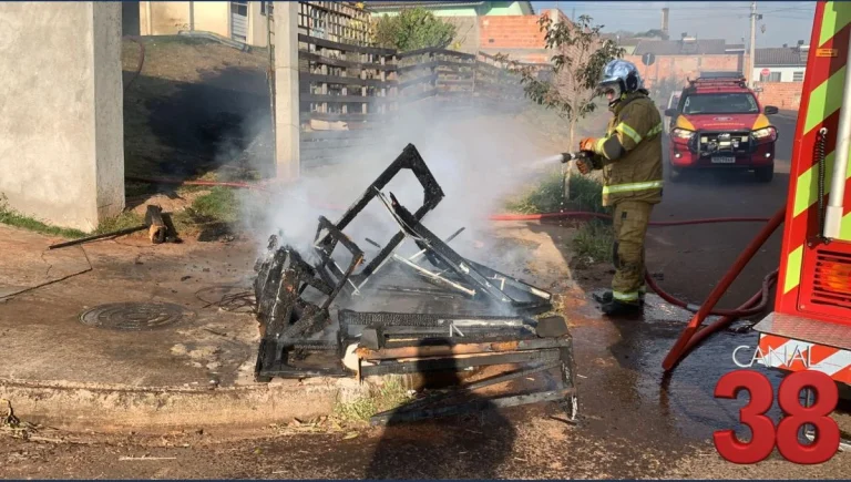Na manhã desta terça-feira (19), por volta das 8h, um incêndio destruiu uma residência localizada no entroncamento da Rua Ângela Cristina Sttopa com a Rua Diácono José Marcato, no Residencial