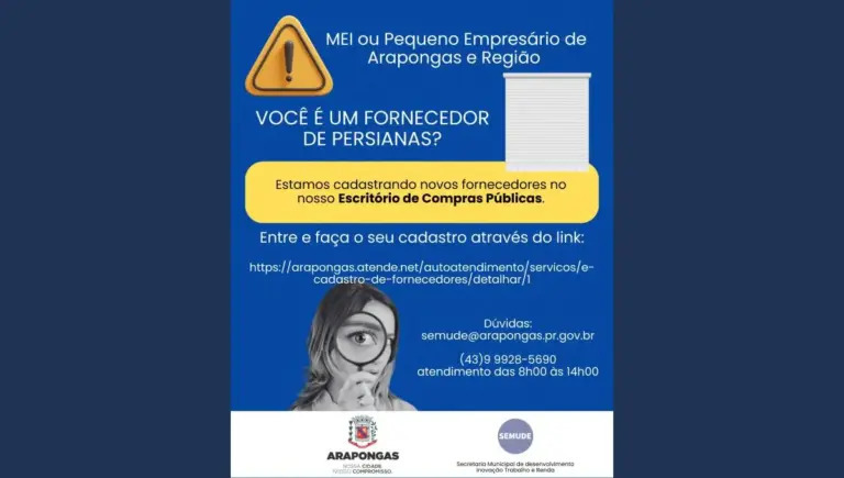 Prefeitura de Arapongas abre cadastro para fornecedores de persianas; oportunidade é voltada a MEIs e pequenos empresários
