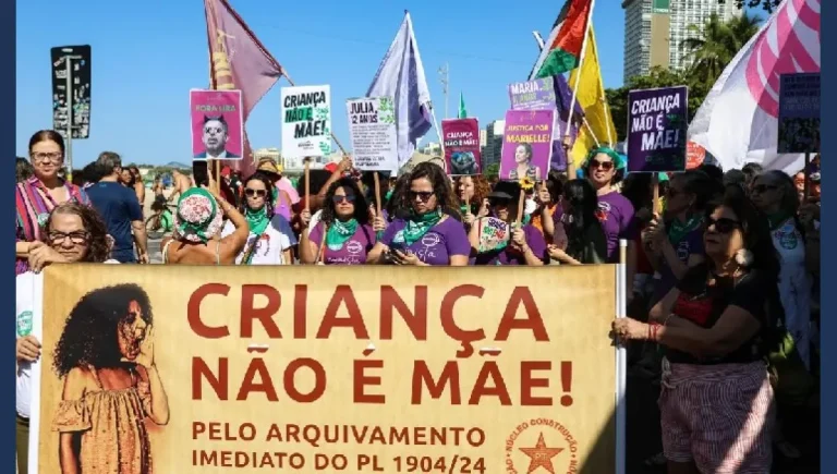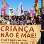 Mulheres pedem que proposta não seja votada na Câmara Centenas de manifestantes se reuniram na Praia de Copacabana, na zona sul do Rio de Janeiro, na manhã deste domingo (23)