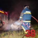 Bombeiros Controlam Rápido Incêndio em Fiat Uno Próximo à Mata do Schmidt; Polícia Militar Investiga as Circunstâncias do Incidente. Na noite desta quarta-feira (13/12/2023), às 21h25, o Corpo de Bombeiros